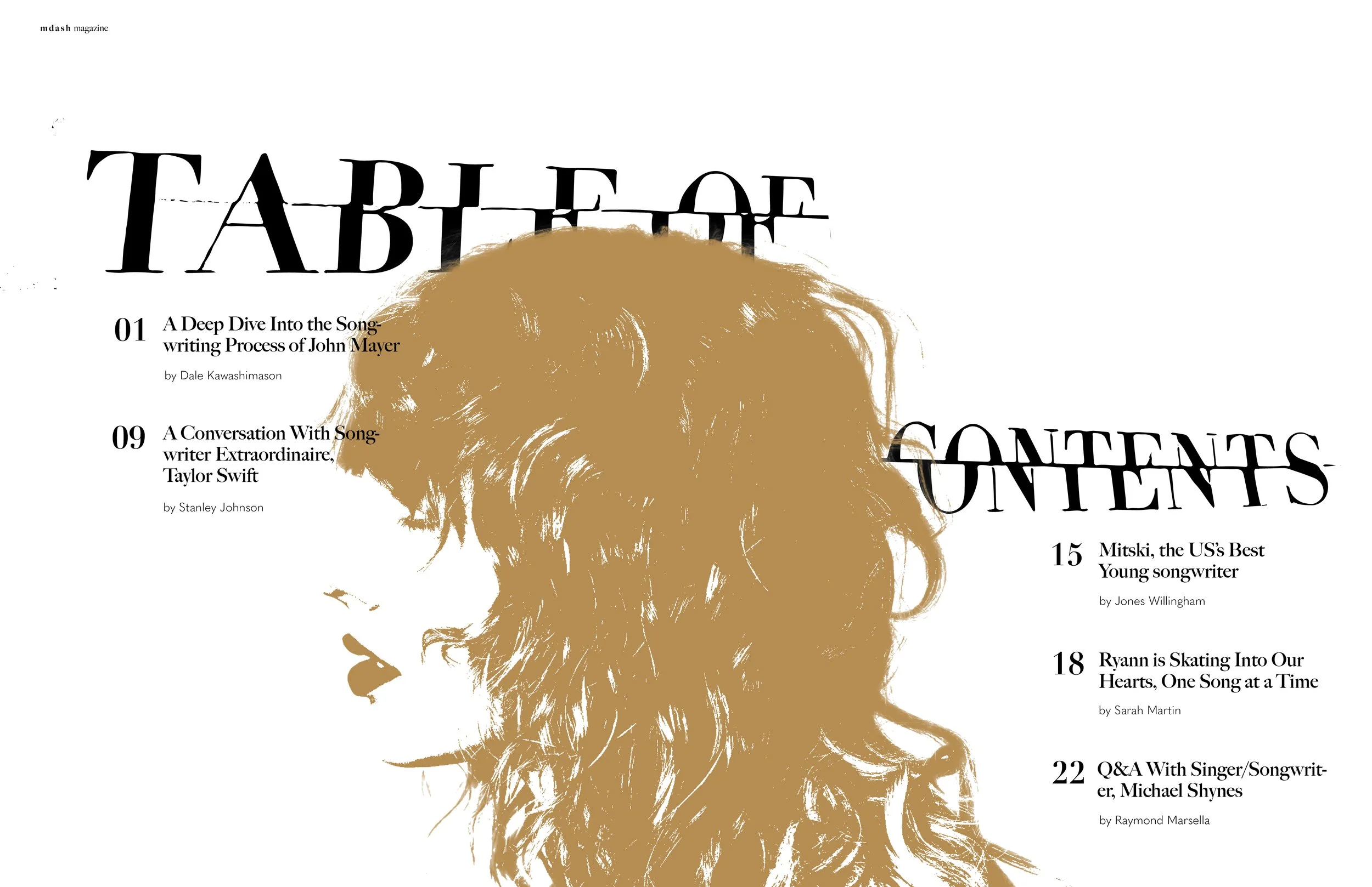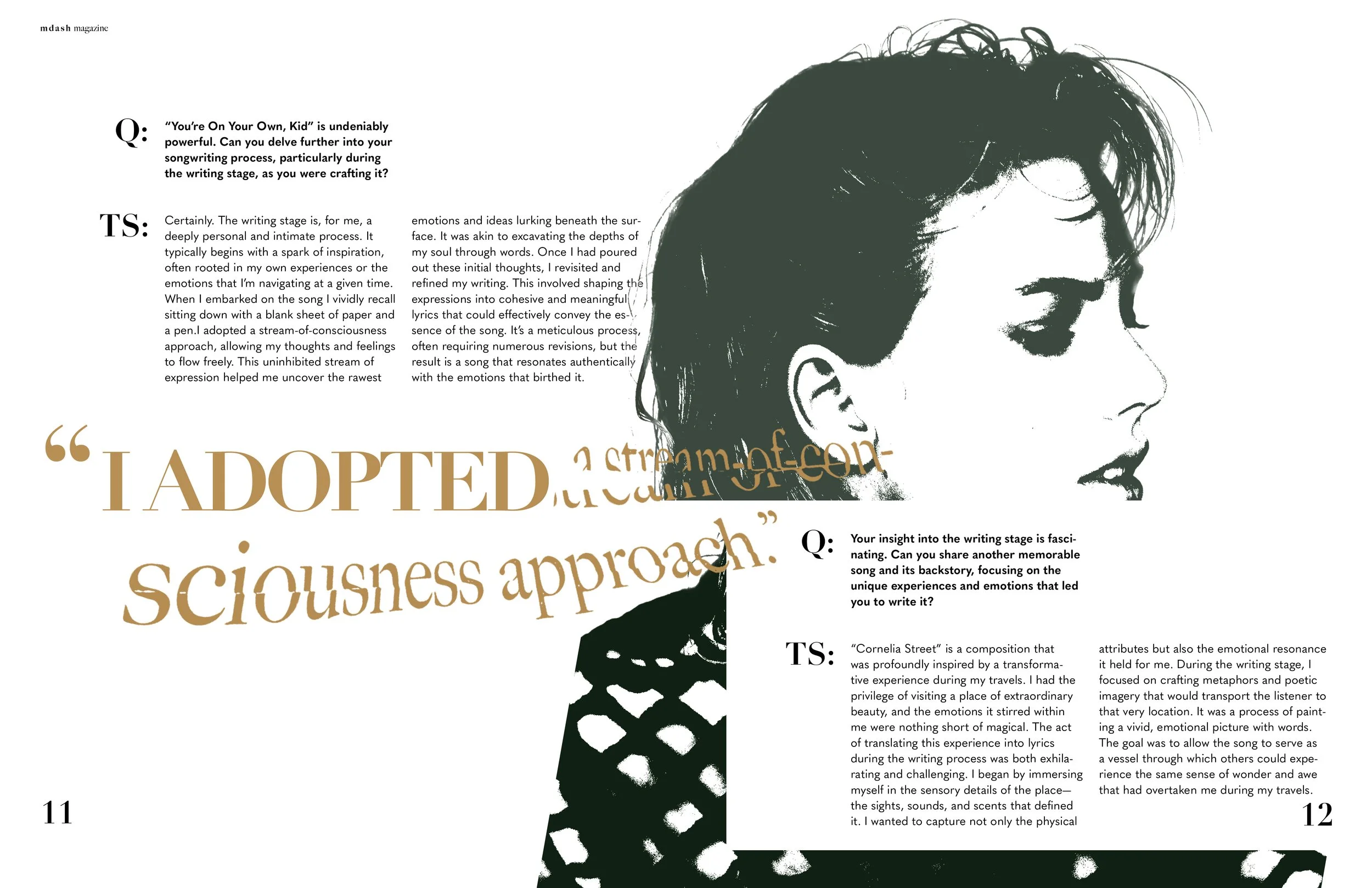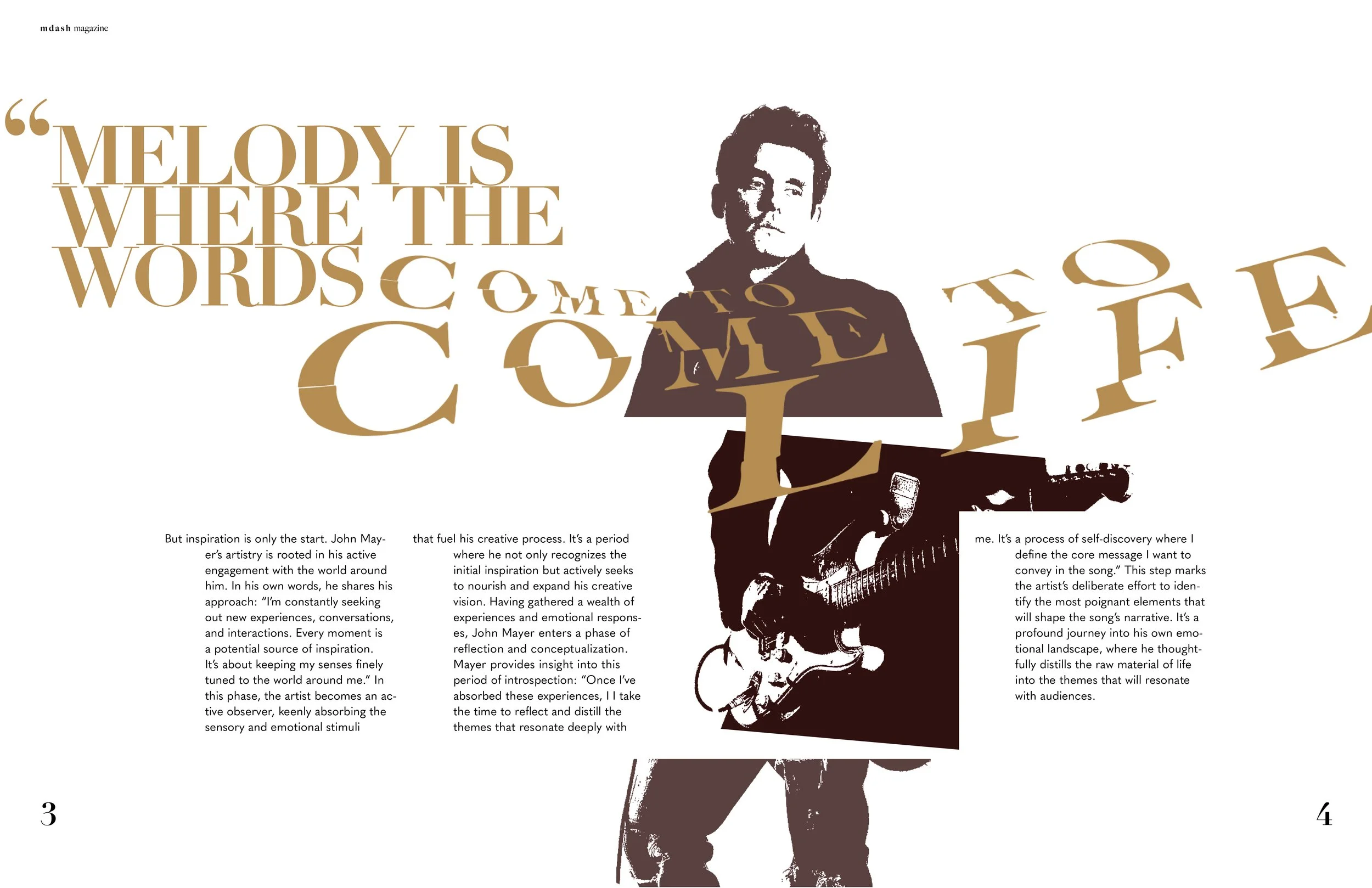 M—Dash is a contemporary writing magazine dedicated to showcasing the craft of songwriting and the unique creative processes behind it. The publication highlights individual songwriters, exploring their inspirations, methodologies, and the stories that shape their work. For this project, I designed the wordmark and a set of editorial spreads that reflect the magazine’s emphasis on individuality.