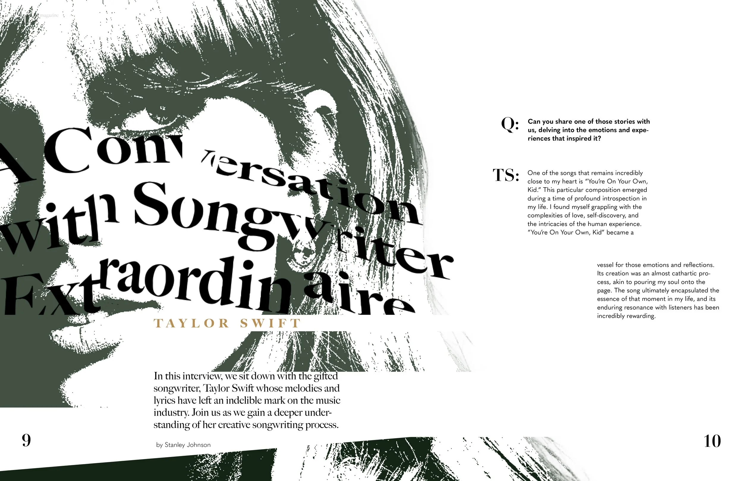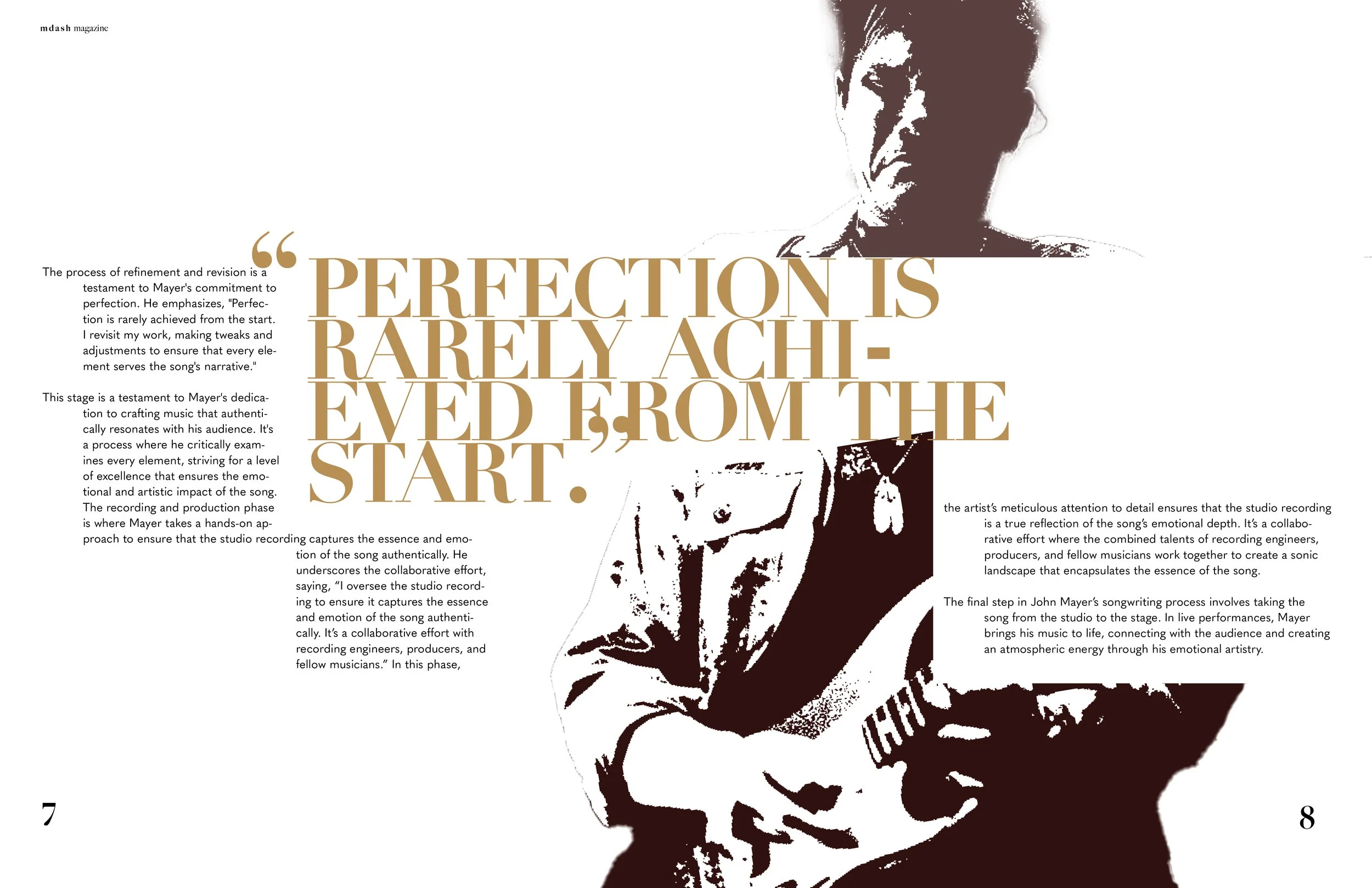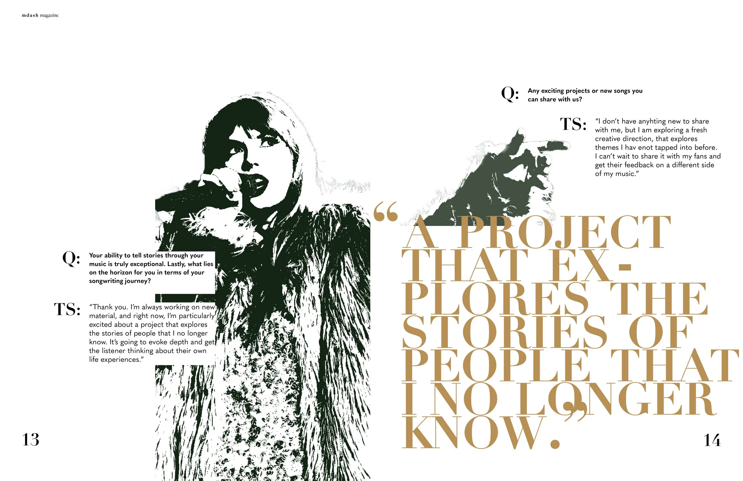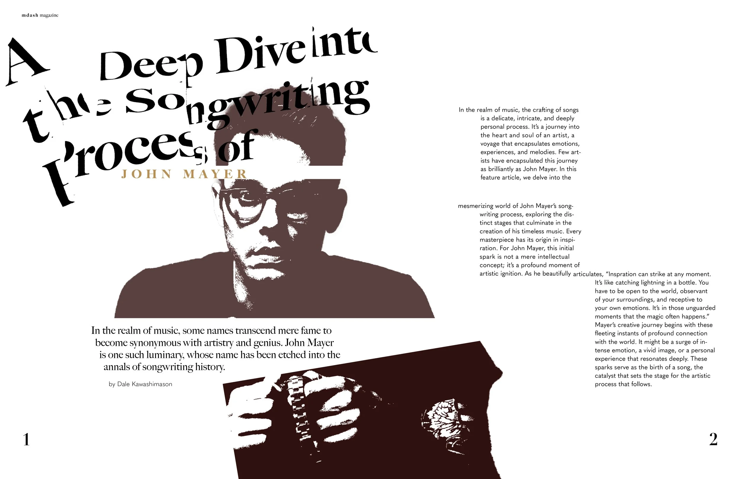 M—Dash is a contemporary writing magazine dedicated to showcasing the craft of songwriting and the unique creative processes behind it. The publication highlights individual songwriters, exploring their inspirations, methodologies, and the stories that shape their work. For this project, I designed the wordmark and a set of editorial spreads that reflect the magazine’s emphasis on individuality.